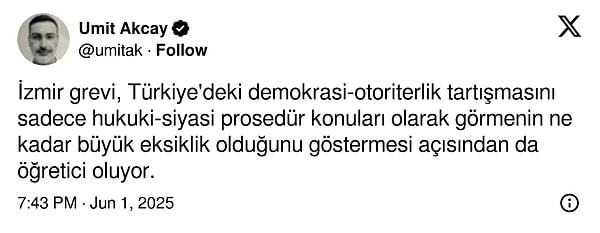 ‘İzmir grevi, Türkiye’deki demokrasi-otoriterlik tartışmasını yalnızca hukuki-siyasi prosedür mevzuları olarak görmenin ne kadar büyük eksiklik olduğunu göstermesi açısından da öğretici oluyor.’