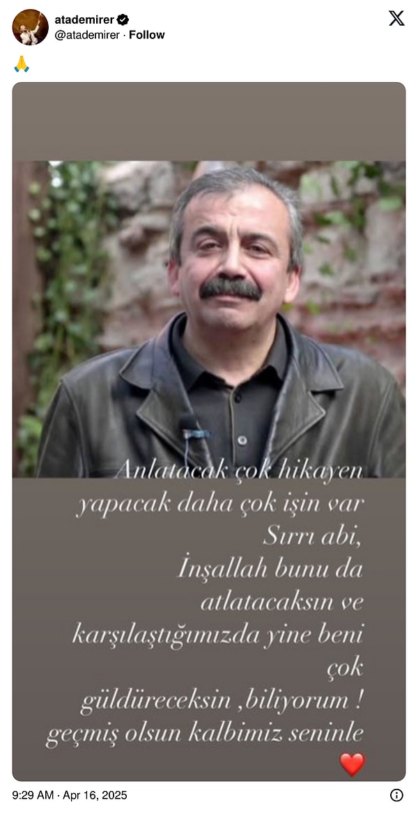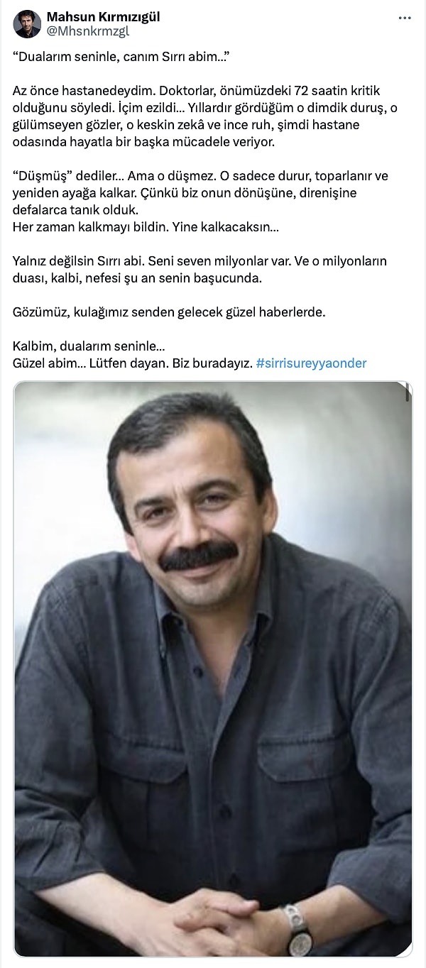 TBMM Başkanvekili olan DEM Parti İstanbul Milletvekili Sırrı Süreyya Başkan, yaklaşık 12 saat süren ameliyatının akabinde ağır bakıma alınmıştı. Ağır bakıma alınan Başkan’ın hekimleri, hastaneye geldiğinde aort damarının yırtıldığının tespit edildiğini açıklamış, durumunun kritik olduğunu belirtmişti.
