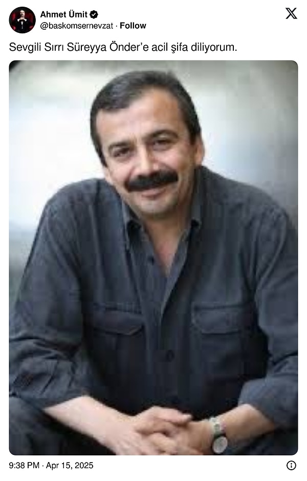 TBMM Başkanvekili olan DEM Parti İstanbul Milletvekili Sırrı Süreyya Başkan dün akşam saatlerinde geçirdiği kalp krizi sonucu ivedilikle hastaneye kaldırılmış, aort damarının yırtıldığının tespit edilmesi üzerine 12 saat süren bir ameliyat geçirmişti.