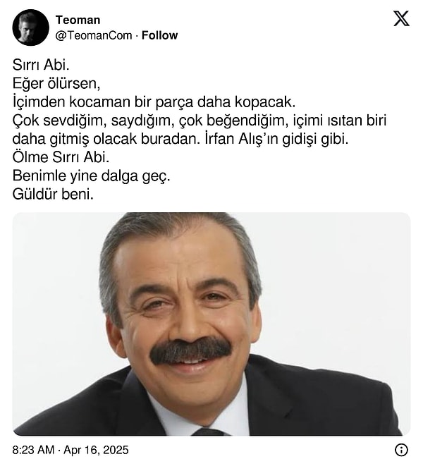 Durumunun kritik olduğu belirtilen Sırrı Süreyya Öncü’ye ünlü dostlarından bildiri gecikmedi.