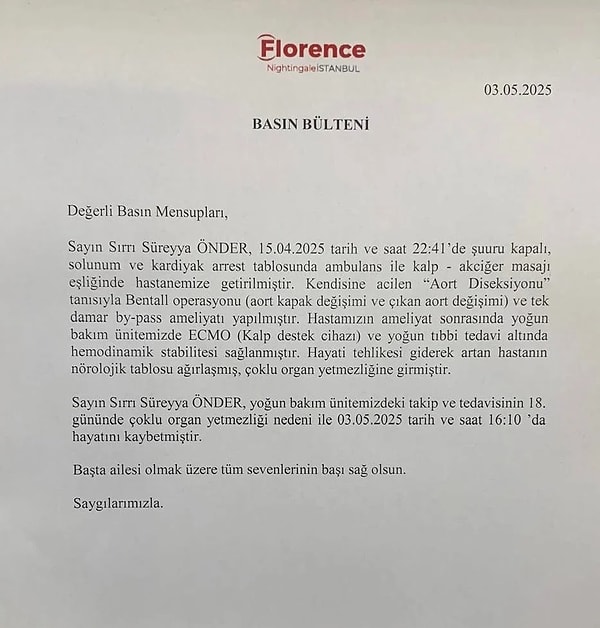 Önder’in tedavi gördüğü hastaneden yapılan açıklamada, ‘Sayın Sırrı Süreyya Lider, 15.04.2025 tarih ve saat 22:41’de şuuru kapalı, teneffüs ve kardiyak arrest tablosunda ambulans ile kalp akciğer masajı eşliğinde hastanemize getirilmiştir. Kendisine hemen ‘Aort Diseksiyonu’ teşhisiyle Bentall operasyonu (aort kapak değişimi ve çıkan aort değişimi) ve tek damar by-pass ameliyatı yapılmıştır. Hastamızın ameliyat sonrasında ağır bakım ünitemizde ECMO (Kalp takviye cihazı) ve ağır tıbbi tedavi altında hemodinamik stabilitesi sağlanmıştır. Hayati tehlikesi giderek artan hastanın nörolojik tablosu ağırlaşmış, çoklu organ yetmezliğine girmiştir. Sayın Sırrı Süreyya ÖNDER, ağır bakım ünitemizdeki takip ve tedavisinin 18. gününde çoklu organ yetmezliği nedeni ile 03.05.2025 tarih ve saat 16:10 ‘da hayatını kaybetmiştir. Başta ailesi olmak üzere tüm sevenlerinin başı sağ olsun’ denildi.