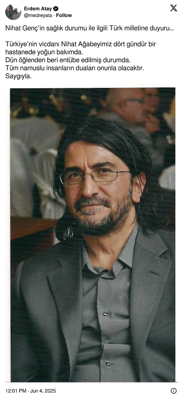 Veryansın TV’den Fazilet Altay, Nihat Genç’in 4 gündür ağır bakımda olduğunu ve dün (3 Haziran) entübe edildiğini açıkladı.
