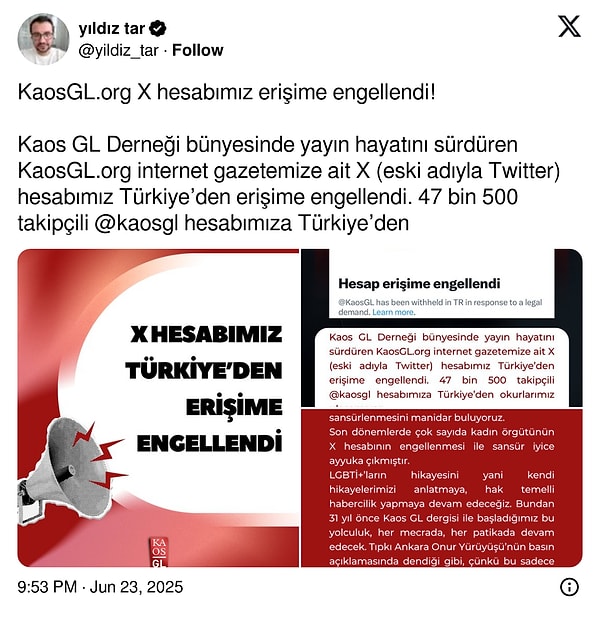 Engelli Web isimli Twitter hesabı, KAOS GL Derneği’nin X hesabınını mahkeme kararı ile engellendiğini duyurdu.