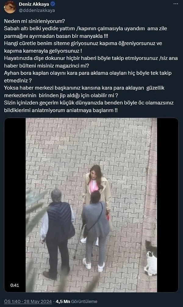 Evinin balkonundan sokakta bekleyen muhabiri görüntüye çekip Twitter’da paylaşan Deniz Akkaya, “Sizin içinizden geçerim küçük dünyanızda benden bu türlü öc olamazsınız bildiklerimi anlatmıyorum anlatmaya başlarım” tabirlerini kullanmıştı.
