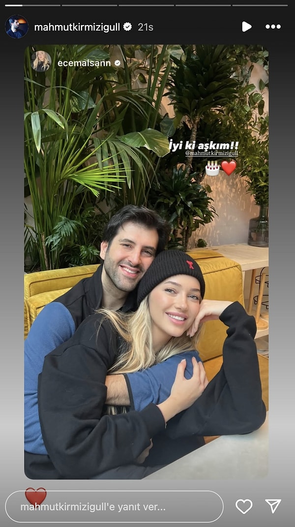 Şarkılarıyla milyonların kalbine dokunan, sinemalarıyla izleyenleri gözyaşlarına boğan Mahsun Kırmızıgül’ün oğlu Mahmut Kırmızıgül aşk hayatıyla gündemde. Toplumsal medyada hayli faal olan Mahmut Kırmızıgül’e, moda dizayncısı sevgilisi Ecem Alsan’dan romantik bir doğum günü kutlaması geldi.
