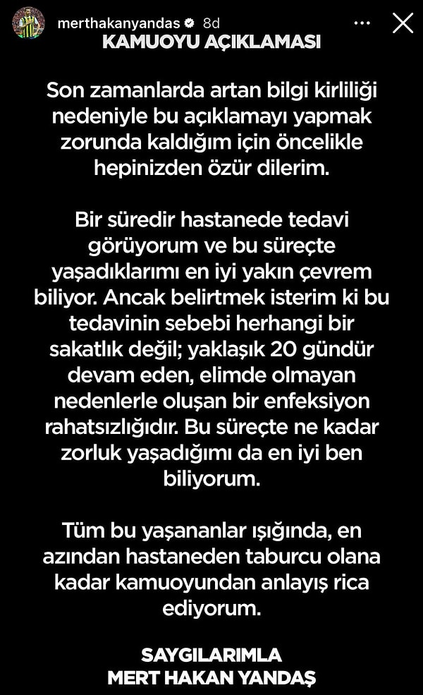 Bir müddettir hastanede tedavi görüyorum ve bu süreçte yaşadıklarımı en âlâ yakın etrafım biliyor. Fakat belirtmek isterim ki bu tedavinin sebebi rastgele bir sakatlık değil; yaklaşık 20 gündür devam eden, elimde olmayan nedenlerle oluşan bir enfeksiyon rahatsızlığıdır. Bu süreçte ne kadar zorluk yaşadığımı da en âlâ ben biliyorum.