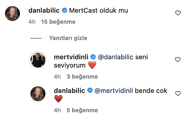Danla Bilic’in hesabında Mert Vidinli’yle DanlaCast kısmına dair rastgele bir paylaşım olmamasına karşın, Mert Vidinli o gün çektikleri pozu paylaşmış, altında da Danla’yı ne kadar çok sevdiğini belirtmişti.