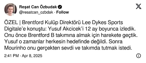‘ÖZEL | Brentford Kulüp Yöneticisi Lee Dykes Sports Digitale’e konuştu: Yusuf Akcicek’i 12 ay boyunca izledik. Onu evvel Brentford B ekibine almak için harekete geçtik.Yusuf o vakitler herkesin amacında değildi. Sonra Mourinho onu hakikaten sevdi ve ekipte tutmak istedi.’