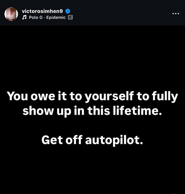 Türkiye’de transfer gündeminin ana konusu haline gelen Osimhen, Instagram hesabından yaptığı paylaşımda şu sözleri kullandı: ‘Bu hayatta tam olarak ortaya çıkmayı kendinize borçlusunuz. Otomatik pilottan çıkın.’