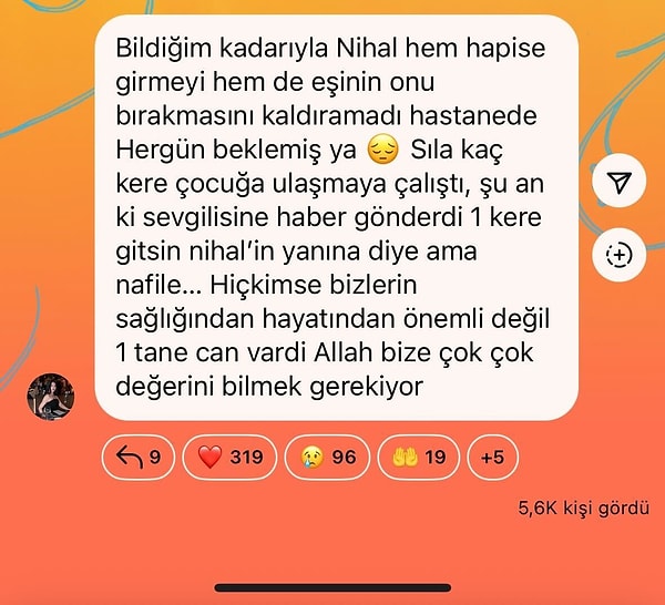 ‘Bildiğim kadarıyla Nihal, hem hapise girmeyi hem de eşinin onu bırakmasını kaldıramadı. Hastanede her gün beklemiş. Sıla, kaç kez çocuğa ulaşmaya çalıştı, şu anki sevgilisine haber gönderdi; bir kez gitsin Nihal’in yanına diye ancak nafile… Hiç kimse bizlerin sıhhatinden, hayatından değerli değil. Bir tane can verdi Allah bize, çok çok bedelini bilmek gerekiyor.’
