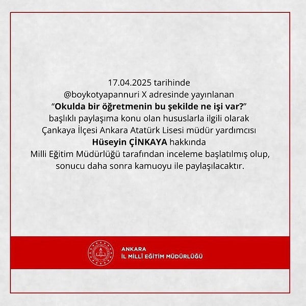 Ankara İl Milli Eğitim Müdürlüğü toplumsal medya hesabından yapılan paylaşımda, ‘@boykotyapannuri X adresinde yayınlanan ‘Okulda bir öğretmenin bu formda ne işi var?’ başlıklı paylaşıma husus olan konularla ilgili olarak Çankaya ilçesi Ankara Atatürk Lisesi müdür yardımcısı Hüseyin Çinkaya hakkında, Milli Eğitim Müdürlüğü tarafından inceleme başlatılmış olup, sonucu daha sonra kamuoyu ile paylaşılacaktır’ denildi.