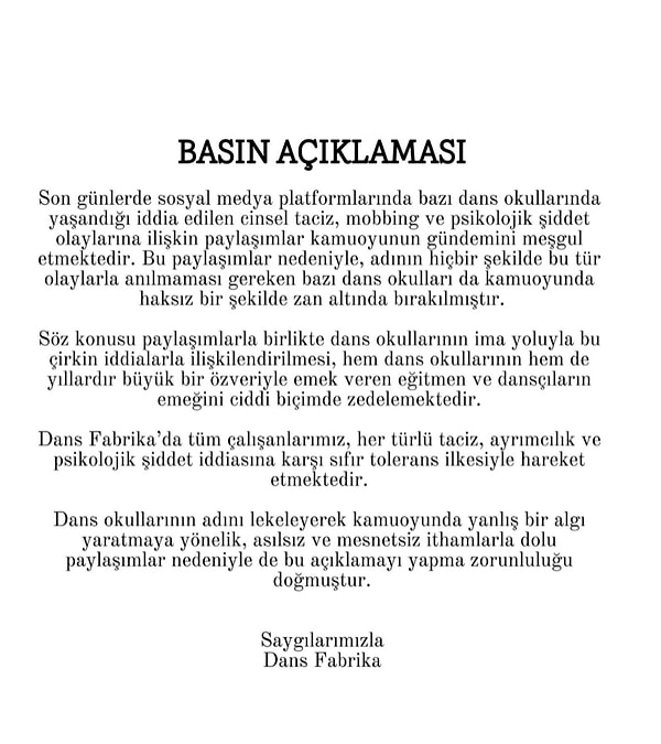 Açıklamada; “Sosyal medyada öne sürülen kimi dans okullarındaki berbat muameleler, öbür dans okullarını da zan altında bırakıyor. Dans okulumuzun tüm çalışanları, her türlü istismar, ayrımcılık ve ruhsal şiddet savına karşı tolerans prensibiyle hareket etmektedir” sözlerine yer verildi.