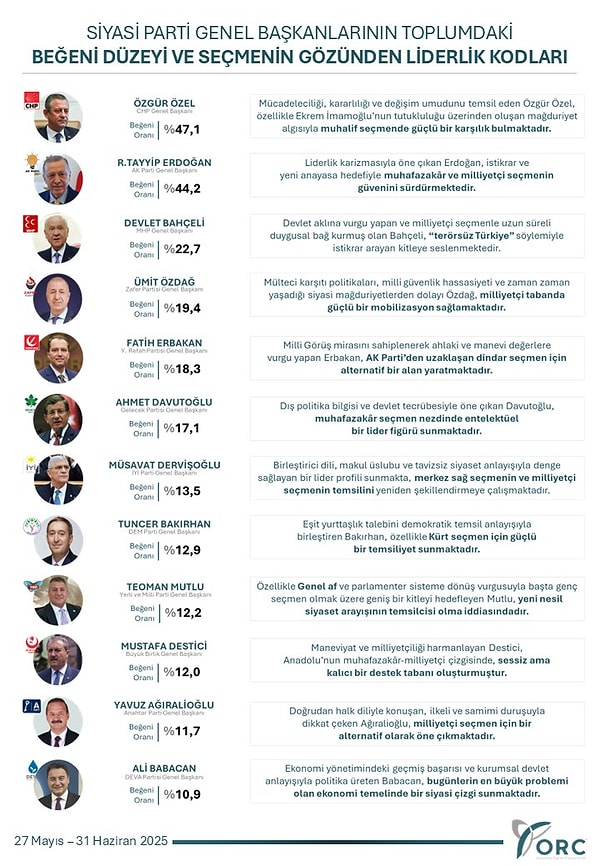 ORC Araştırma tarafından yapılan son anket çalışmasına göre CHP Genel Başkanı Özgür Özel, Cumhurbaşkanı ve AKP Genel Başkanı Recep Tayyip Erdoğan’ı geçerek en yüksek beğeni düzeyine ulaşan siyasi parti genel lideri oldu.