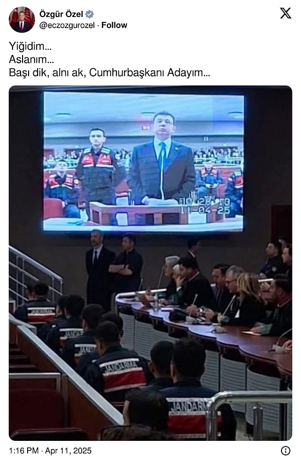 İBB Başkanı Ekrem İmamoğlu’nun bugün (11 Nisan Cuma) iki farklı davası görüldü. İstanbul Cumhuriyet Başsavcısı Akın Gürlek davasında savunma yapan Ekrem İmamoğlu’nun mahkemeden birinci imajı de paylaşıldı.