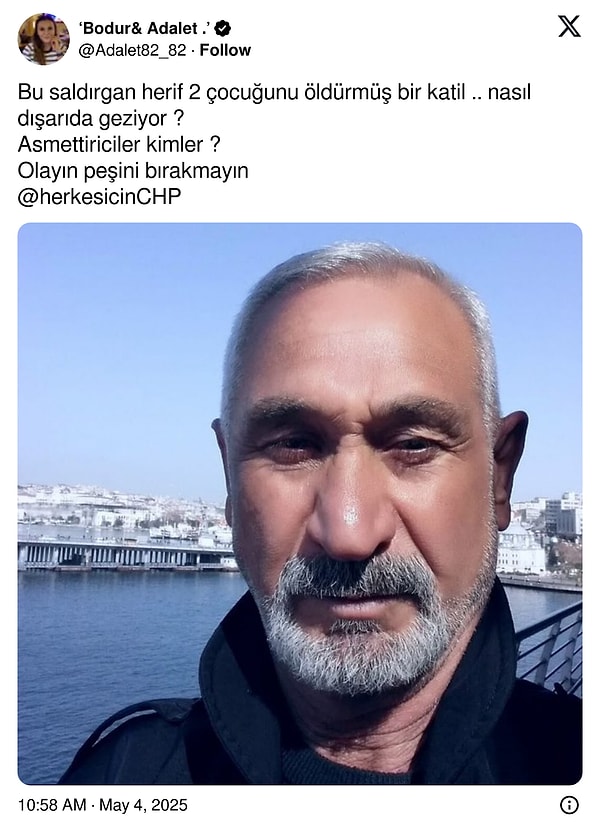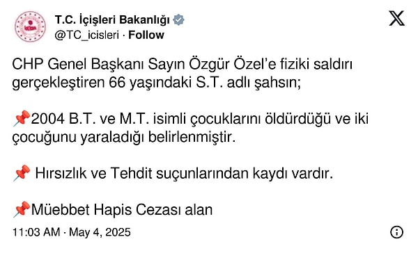 ‘CHP Genel Lideri Sayın Özgür Özel’e fiziki hücum gerçekleştiren 66 yaşındaki S.T. isimli şahsın;