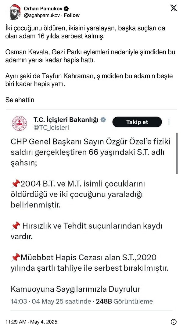 CHP Genel Başkanı Özgür Özel’e AKM’de Sırrı Süreyya Lider için düzenlenen merasimde hücum düzenlendi. Özel, merasim alanından ayrılırken bir şahsın yakın saldırısına uğradı. Özel’e yumruk atan şahsın kimliği belirli oldu ve şahsın sabıkası da ortaya çıktı. İçişleri Bakanlığı, saldırganın kendi çocuklarını öldürdüğünü, iki çocuğunu da yaraladığını ve hırsızlıktan, tehdit kabahatlerinden da kaydı olduğunu doğruladı.