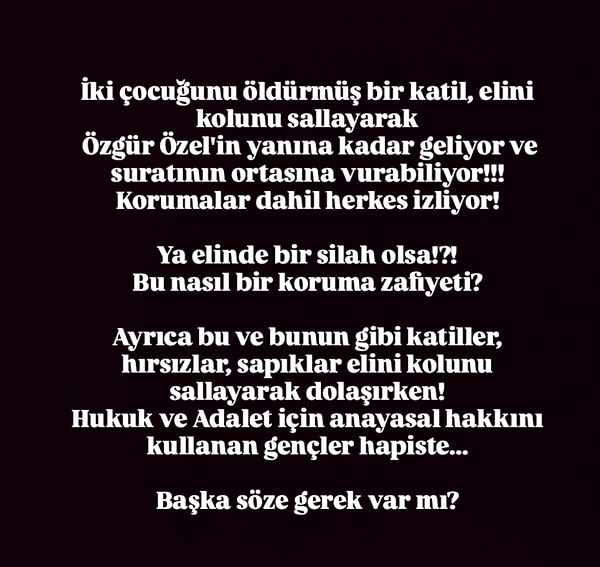 Özgür Özel’in uğradığı saldırıyı kınayan isimlerden birisi de Şahan Gökbakar oldu. Gökbakar, “Bu nasıl bir muhafaza zafiyeti?” diyerek müdafaanın yetersizliğine vurgu yaptı.