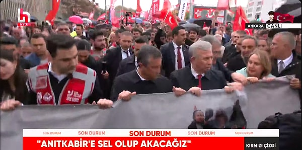 Özgür Özel, ‘Sizden ricam, her biri vatanın evladı, her biri aile babası annesi, aslında çocuğu atanamayan öğretmen polislerimiz, her meslekten… Onları incitmeden lakin önünüze konulan barikatı da asla asla dinlemeden sel oluyoruz Anıtkabir’e akıyoruz. Buyrun bakalım’ dedi. Bu kelamların akabinde halk barikata yüklenerek barikatı aştı ve Anıtkabir’e kortej halinde yürüyüş başladı.