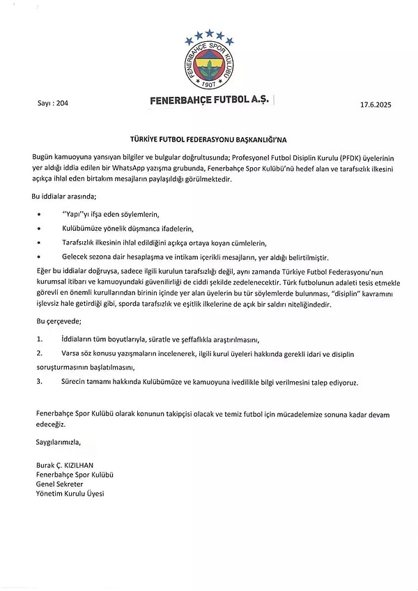 Fenerbahçe, Profesyonel Futbol Disiplin Kurulu (PFDK) üyelerine ilişkin olduğu öne sürülen WhatsApp yazışmalarının basına yansımasının akabinde harekete geçti. Sarı-Lacivertli kulüp, kelam konusu iletilerle ilgili Türkiye Futbol Federasyonu’na (TFF) resmi müracaatta bulunduğunu açıkladı. Yazışmalarda birtakım kulüp liderleri ve teknik yöneticilerle ilgili tarafsızlığa ters tabirler yer alması, sarı lacivertli toplulukta reaksiyon çekmişti. Fenerbahçe, bu gelişmenin ciddiyetle soruşturulması gerektiğini vurguladı.