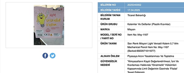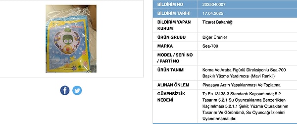 Ticaret Bakanlığı, Güvensiz Ürün Bilgi Sistemi aracılığıyla insan sağlına ziyanlı unsurlar bulunduran eserleri ifşalamaya devam ediyor.