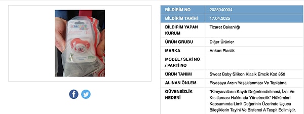 Bakanlığın paylaşımına nazaran, “Sweet Baby” markalı emzikte kimyasal eser tespit edildi.