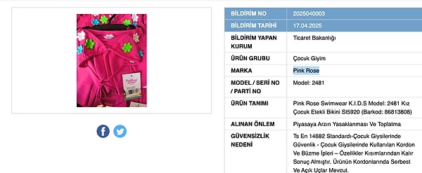 Ayrıca “Pink Rose” isimli markanın çocuklar için ürettiği etekli bikini de güvenlik nedeniyle toplatılmaya karar verildi.