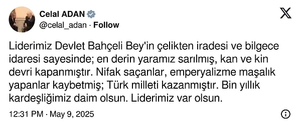 “Liderimiz Devlet Bahçeli Bey’in çelikten iradesi ve bilgece yönetimi sayesinde; en derin yaramız sarılmış, kan ve kin zamanı kapanmıştır. Nifak saçanlar, emperyalizme maşalık yapanlar kaybetmiş; Türk milleti kazanmıştır. Bin yıllık kardeşliğimiz daim olsun. Önderimiz var olsun.”