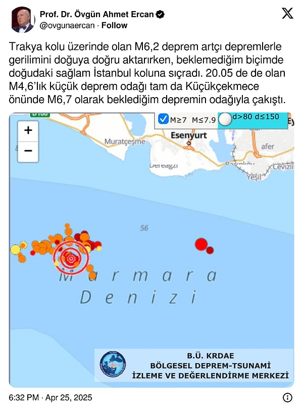İstanbul’un Silivri açıklarında meydana gelen 6.2 büyüklüğündeki sarsıntı büyük kaygıya neden olmuştu. Jeofizik Yüksek Mühendisi Prof. Dr. Övgün Ahmet Ercan, Silivri zelzelesinden sonra artçı sarsıntıların merkez üssünün doğusunda olmasının tehlikeli olabileceğini açıklamıştı.