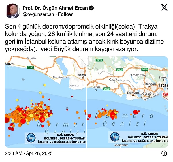 İstanbullular 23 Nisan günü meydana gelen 6.2 büyüklüğündeki sarsıntının korkusunu yaşarken 25 Nisan Cuma akşamı saat 20.33’te AFAD’ın datalarına 4.3’lük bir sarsıntı meydana geldi. Jeofizik Yüksek Mühendisi Prof. Dr. Ahmet Ercan, bu sarsıntının İstanbul kolunda olduğunu ve bunun ‘hoş karşılanacak artçı deprem’ olmadığını belirtti. Bu açıklamalar tedirginliği artırırken sabaha kadar fay hareketliliğini izleyen Ahmet Ercan’dan yürekle su serpen bir paylaşım sabah saatlerinde geldi.