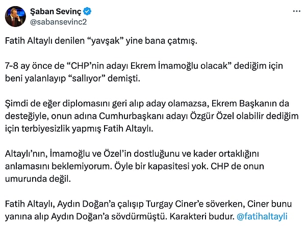 Altaylı, YouTube hesabındaki yayınında CHP’deki adaylık tartışmalarına değinirken Şaban Sevinç hakkında ”Şaban Sevinç şey demiş; “İmamoğlu olmazsa adaylık Özgür Özel’e yanlışsız masraf.” Gitmez kardeşim! CHP’nin iki adayı var; bir İmamoğlu, zati şu anda aday fırsat olursa, iki Mansur Yavaş. İmamoğlu’nun adaylığı YSK’dan geçmezse, diploma sıkıntısı, diploma komplosu diyeyim, türel bir formda halledilmezse Mansur Yavaş. Şimdiden başlıyorlar “Efendim Mansur Yavaş kim ya, bu esasen MHP’li, bakın etrafındakilere çok makûs adamlar…” Artık bu herkesin egosunu parlatır” sözlerini kullandı.