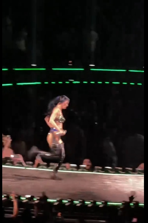 Bir konserinde ise koca sahneyi koşarak turladıktan sonra sahnenin azizliğine uğradı ve kıyafeti açıldı. Asistanından gerekli yardımı alırken yaptığı latife ise dikkat çekti.