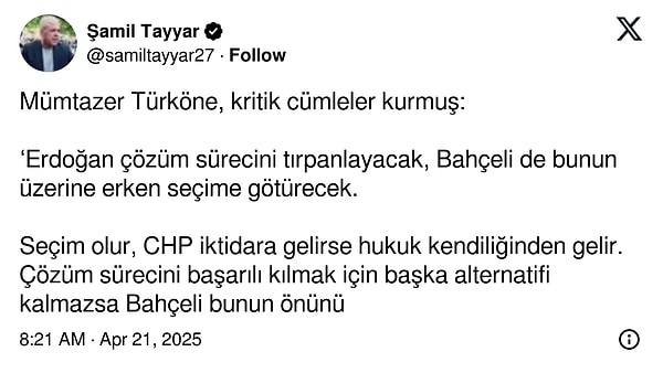 Eski AKP Milletvekili Şamil Tayyar, Mümtazer Türköne’nin “Devlet Bahçeli 2025 yılı içerisinde erken seçim daveti yapacak” savına reaksiyon gösterdi.