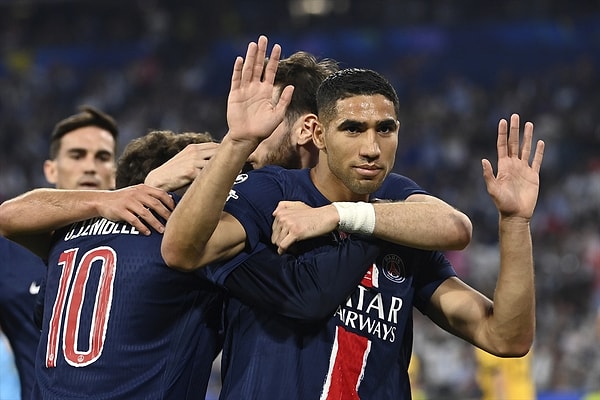 Hakimi ve Doue’nin golleriyle PSG devreyi 2-0 önde kapattı. Hakimi, eski ekibi Inter’e attığı golün akabinde sevinmedi ve tribünlere ‘özür’ işareti yaptı kadro arkadaşları sevinirken .