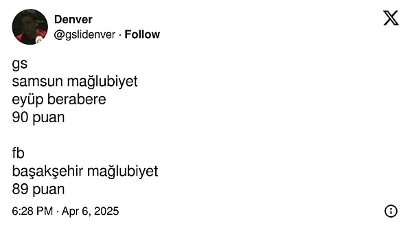 Galatasaray ve Fenerbahçe’nin ligi birebir puanda bitirmesi durumunda şampiyon Galatasaray olacak. Fenerbahçe’nin şampiyon olabilmesi için tüm maçlarını kazanması ve Galatasaray’ın üç puandan daha fazla puan kaybı yaşaması gerek. Zira iki kadro birebir puana sahip olursa ikili averaja bakılır ve ikili averajda üstün olan Galatasaray. Okan Buruk ve öğrencileri, ligin birinci yarısında Fenerbahçe’yi deplasmanda 3-1’le geçmiş, rövanşta ise meskeninde 0-0 berabere kalmıştı.