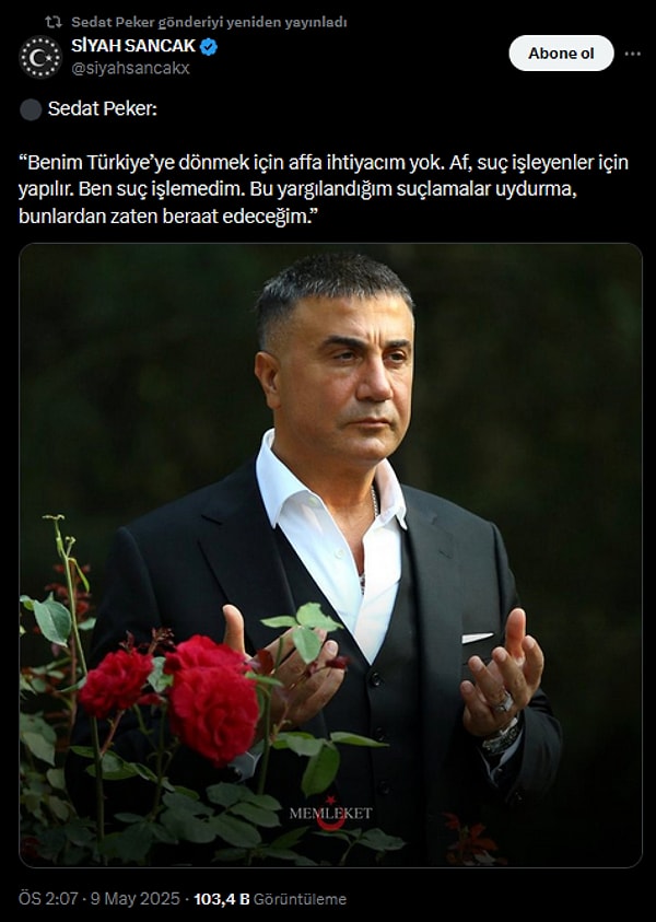 Son olarak Sedat Peker’in hakkında çıkarılacak bir af ile Türkiye’ye dönüş yolunun açılacağı ve gerçi döneceği sav edilmişti. Peker, X hesabından hususa ait paylaşılan bir gönderiyi yine paylaştı. Kelam konusu paylaşım şöyle: ‘Benim Türkiye’ye dönmek için affa gereksinimim yok. Af, kabahat işleyenler için yapılır. Ben kabahat işlemedim. Bu yargılandığım suçlamalar uydurma, bunlardan zati beraat edeceğim.
