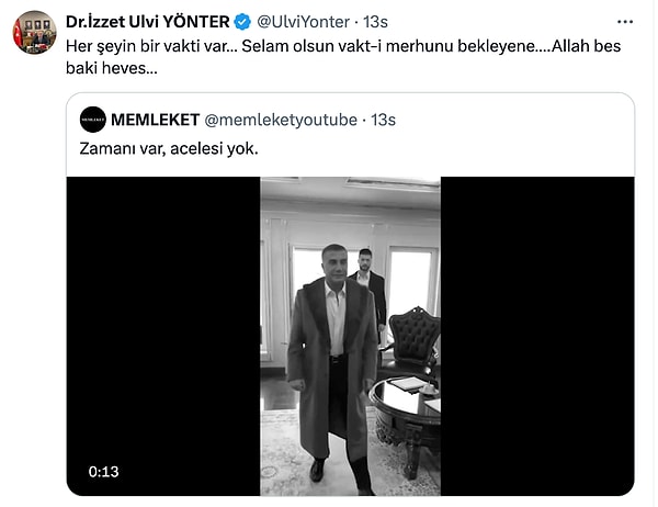 Zaman vakit Sedat Peker hakkında yaptığı paylaşımlarla gündem olan MHP Genel Lider Yardımcısı İzzet Ulvi Yönter’den dikkat çeken bir paylaşım geldi. Sedat Peker için yapılan ve ‘Zamanı var ivedisi yok’ yazılı bir görüntüyü toplumsal medya hesabından paylaşan MHP’li Yönter “Her şeyin bir vakti var… Selam olsun vakt-i merhunu bekleyene” yazdı. Yönter’in bu paylaşımı “Sedat Peker Türkiye’ye mi dönüyor” sorularına neden oldu.