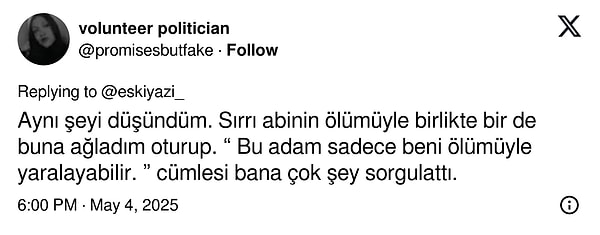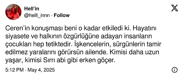 ‘Ceren’in konuşması beni o kadar etkiledi ki. Hayatını siyasete ve halkının özgürlüğüne adayan insanların çocukları daima tetiktedir. Azapların, sürgünlerin tamir edilmez yaralarını görürsün ailende. Kimisi daha uzun yaşar, kimisi Sırrı abi üzere erken göçer.
