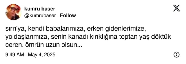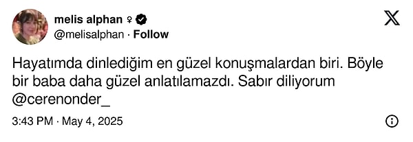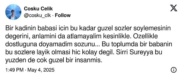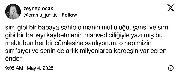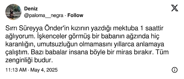 ‘Sırrı Süreyya Başkan’ın kızının yazdığı mektuba 1 saattir ağlıyorum. Azaplar görmüş bir babanın ağzında hiç karanlığın, ümitsizliğin olmamasını yıllarca anlamaya çalıştım. Birtakım babalar beşere bu türlü bir miras bırakır. Tüm zenginliği budur.