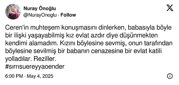 3 Mayıs günü 18 günlük hayat uğraşını kaybeden Sırrı Süreyya Başkan sevenlerini yasa boğdu. TBMM Başkanvekili ve DEM Parti İstanbul Milletvekili Sırrı Süreyya Lider için 4 Mayıs Pazar günü İstanbul’da cenaze merasimi düzenlendi. Önder’in kızı Ceren Başkan Kandemir’in babası gerisinden söyledikleri yürekleri dağladı. Sırrı Süreyya Önder’in örnek babalığı ve kızı Ceren Başkan Kandemir’in baba sevgisine X’te duygulandıran yorumlar yapıldı.