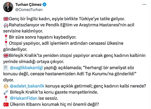 İngiliz medyasında yer alan haberlere ve İYİ Parti milletvekili Turhan Çömez’in Meclis gündemine taşıdığı olaya nazaran; İngiliz turist Beth Martin, tatil için geldiği Türkiye’de rahatsızlanarak Pendik Eğitim ve Araştırma Hastanesi’ne kaldırılıyor. Yaşadığı rahatsızlık nedeniyle Martin’e otopsi yapılıyor ve isimli süreçlerin akabinde ülkesine gönderiliyor.