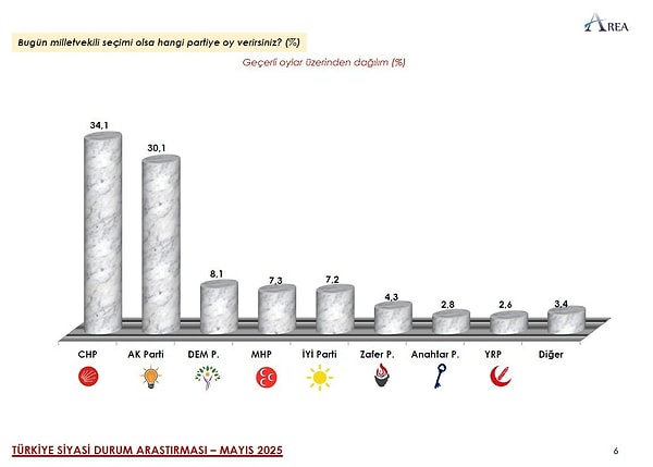 AREA Araştırma’nın yaptığı milletvekili seçim anketinde CHP’nin oranı yüzde 34,1 oldu. AKP yüzde 30,1 ile ikinci, DEM Parti ise yüzde 8,1 ile üçüncü parti oldu.
