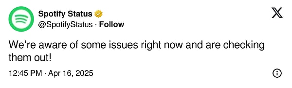 Spotify resmi takviye hesabı ve yetkilileri tarafından açıklama, 15.00 sularında yapıldı. Sorunun kaynağı ve ne vakit çözüleceği konusunda rastgele bir bilgi verilmedi ancak Spotify resmi açıklamasında, ‘Şu anda birtakım meselelerin farkındayız ve bunları inceliyoruz!’ tabirlerini kullandı.