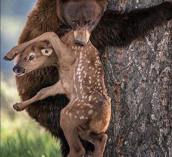 14. “Ağaçta yavru geyikle birlikte ayı.”