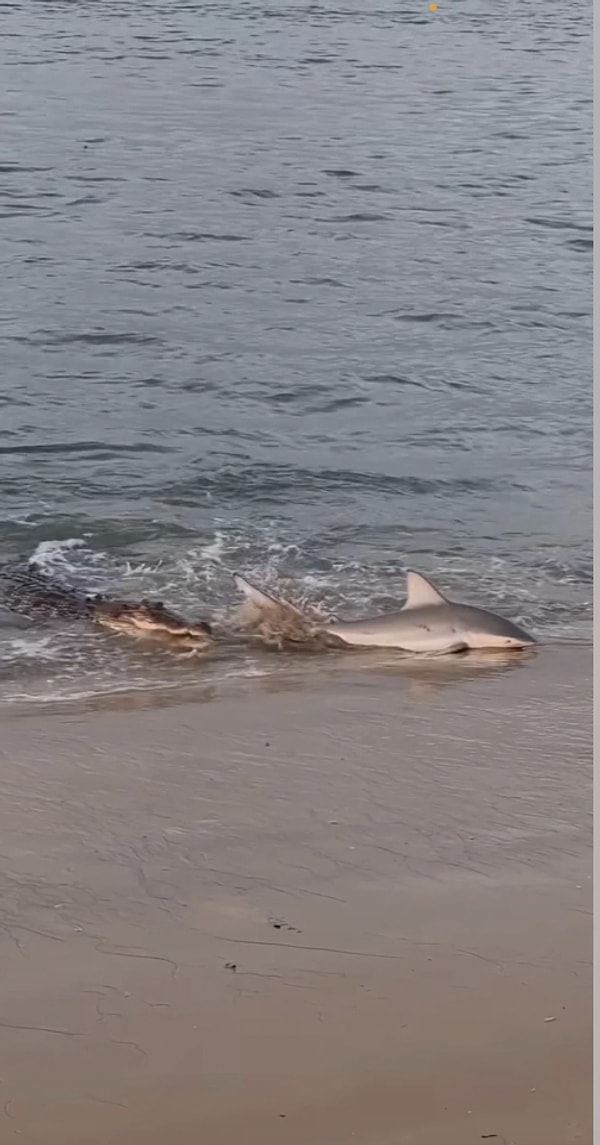 ‘Su timsahı bir köpekbalığını yemeye çalışıyor.’