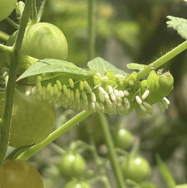 ‘Yaban arıları tarafından parazitlenen domates kurdu.’