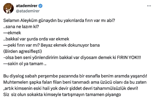 ‘Bu diyalog sabah, perşembe pazarında bir esnafla benim aramda yaşandı! Muhtemelen şapka falan filan beni tanımadı ancak üzücü olanı da bu zati, artık kimsenin eski hali yok! Zaman şiddet bölümü, tahammülsüzlük devri! Siz siz olun sokakta kimseyle tartışmayın büsbütün piyango!’ dedi.