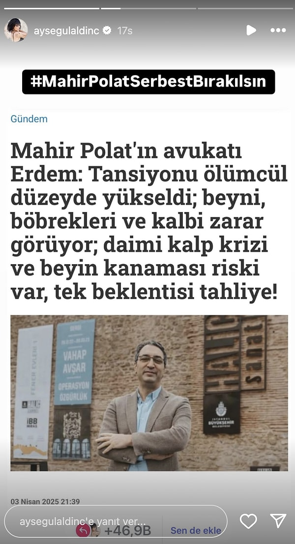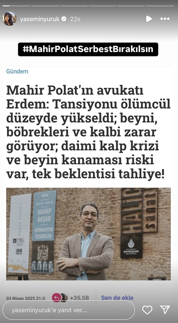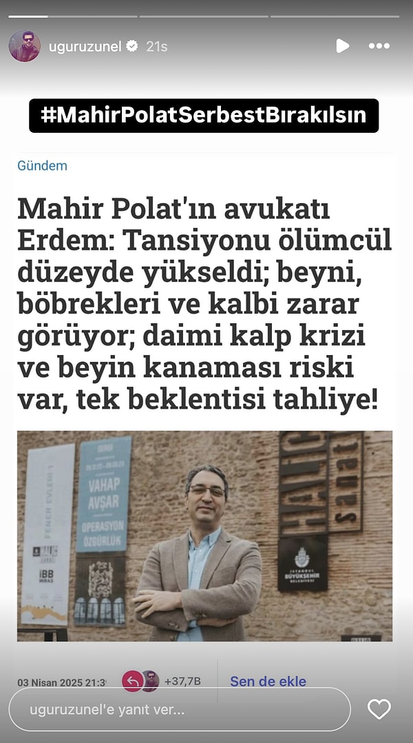 19 Mart’ta gözaltına alındıktan sonra 23 Mart’ta tutuklanarak Silivri Cezaevi’ne gönderilen Uzman Polat’ın sıhhat durumu kamuoyunun gündeminde. Avukatı, kalp rahatsızlığı, diyabet, hipertansiyon ve uyku apnesi üzere problemlerle çaba eden Polat’ın cezaevi şartlarında hayatının tehdit altında olduğunu açıklamıştı. Toplumsal medyada “Mahir Polat Özgür Bırakılsın” ve “Mahir Polat’ı Hür Bırakın” etiketleriyle başlatılan kampanyaya müzikçilerden oyunculara kadar birçok tanınmış isim dayanak veriyor.