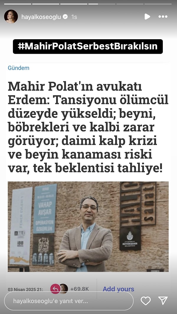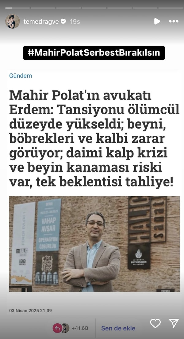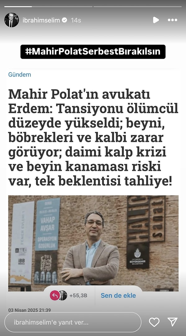 Mahir Polat’ın sıhhat münasebetleriyle özgür bırakılması tarafındaki davetler toplumsal medyada her geçen gün daha da güç kazanıyor. “Mahir Polat Özgür Bırakılsın” ve “Mahir Polat’ı Hür Bırakın” etiketleriyle başlatılan kampanyaya pek çok ünlü isim de takviye verdi.