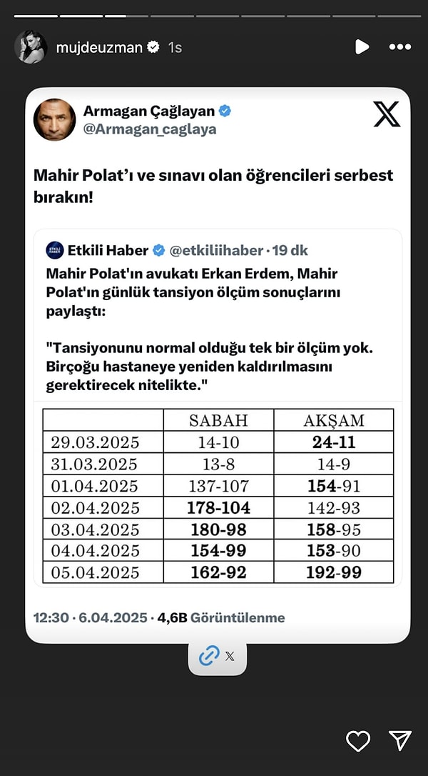 Avukat Erdem, son olarak Polat’ın cezaevinde yapılan bir haftalık tansiyon ölçümlerini de kamuoyuyla paylaşarak “Durumu abartısız ve eksiksiz bildiriyorum: Hayati tehlikesi devam ediyor, cezaevi şartları sıhhatine mütemadiyen ziyan veriyor” tabirlerini kullandı.