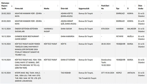 Güncellenen listeye, ‘dana’ diye ‘domuz’ eti satan firmala eklendi.